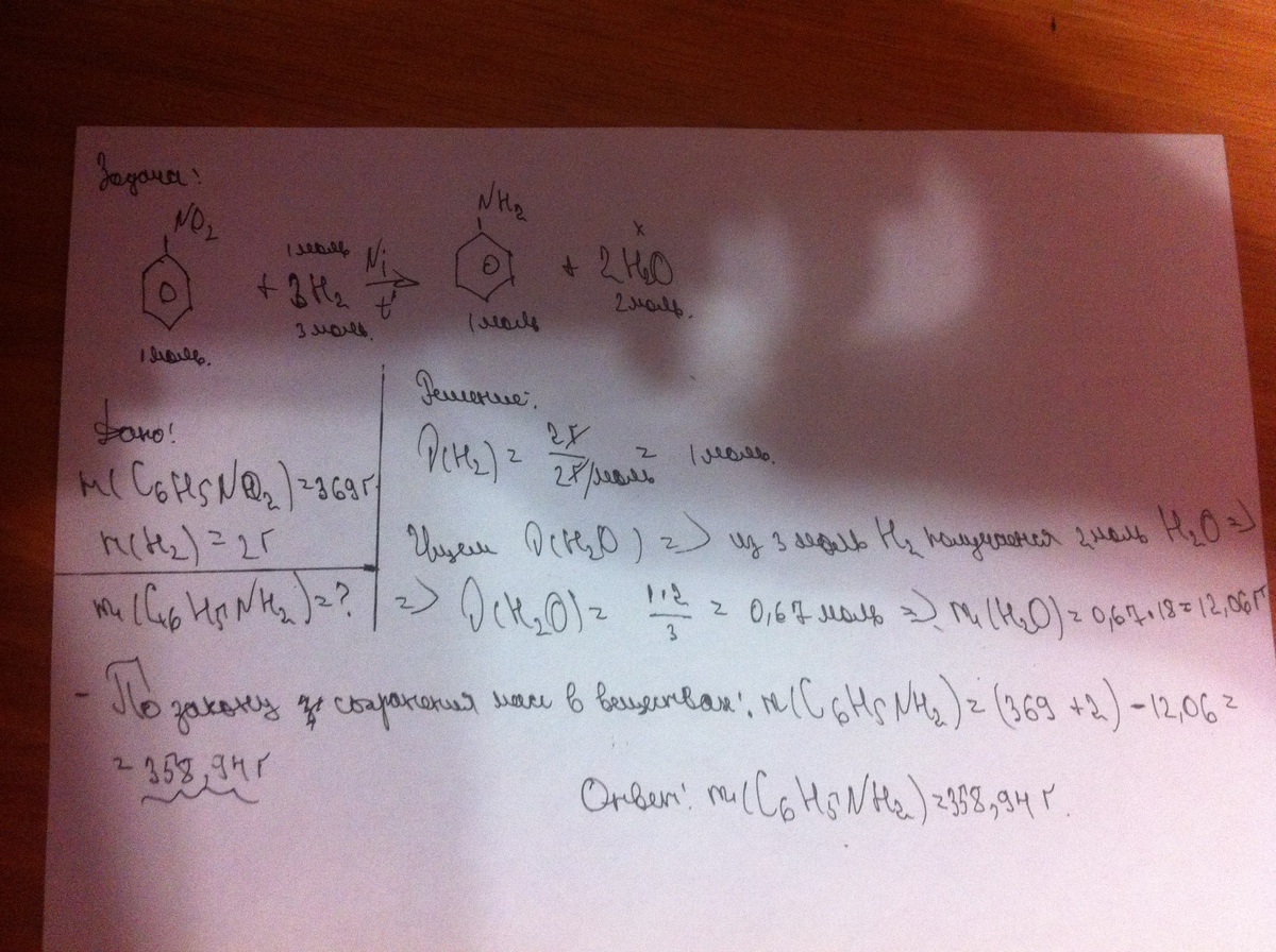 Определите массу амина, полученного при взаимодействии 369 г нитробензола и 2 г водорода. Решение пожалуйста!