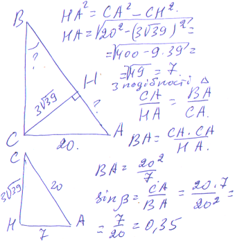 В прямоугольном треугольнике АВС катет АС=20 а высота СН опущенная на гипотенузу равна 3 корень из 39. Найдите sin угла АВС