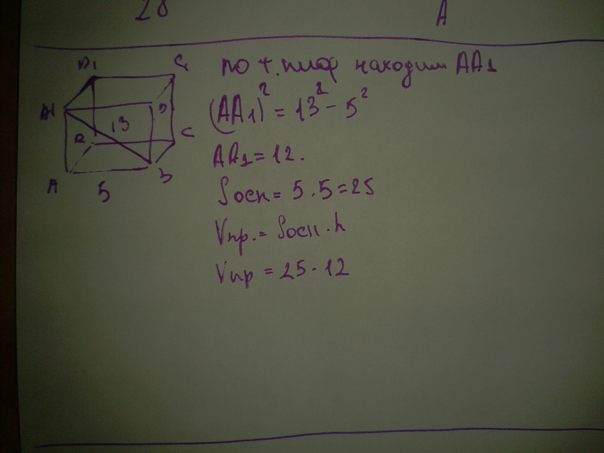 Сторона основания правильной четырехугольной призмы равна 5 см, а диагональ боковой грани 13 см. найдите объем призмы.