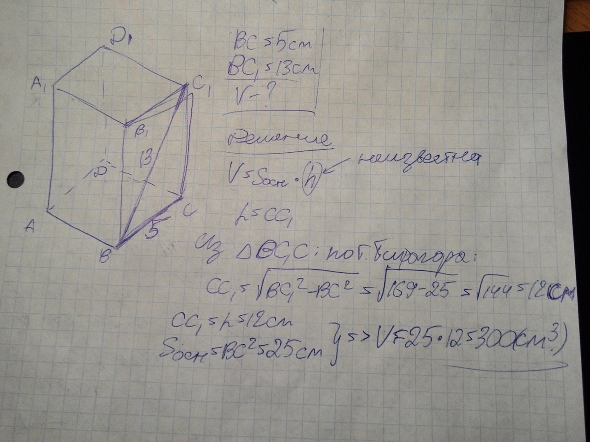 Сторона основания правильной четырехугольной призмы = 5 см, а диагональ боковой грани13 см. Найти объем боковой призмы.