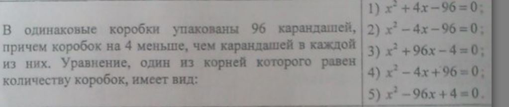 В одинаковые коробки упакованы 96 карандашей,причём коробок на 4 меньше ,чем карандашей в каждой из них.Уравнение один из корней которого равен количеству коробок, имеет вид (в картинке)