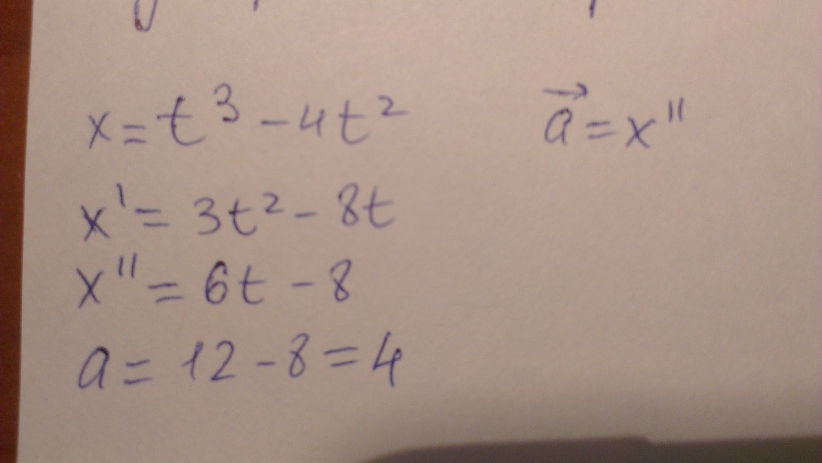 Материальная точка движется прямолинейно по закону x(t)=t^3-4t^2. Найдите ускорение в момент времени t=2.