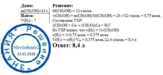 Рассчитайте объём водорода измеренный при нормальных условиях, которые выделяются при взаимодействии 24 г. метанола с металлическим кальцием.