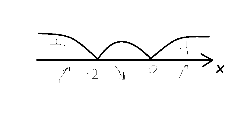 y возрастает на тех промежутках, где производная больше нуля, а это от -безконечности до -2 в объединении с от 0 до + безконечности