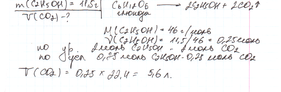 При брожении глюкозы получено 11.5 г этанола. Какой объем углекислого газа(н.у.) при этом выделится? (5,6л)