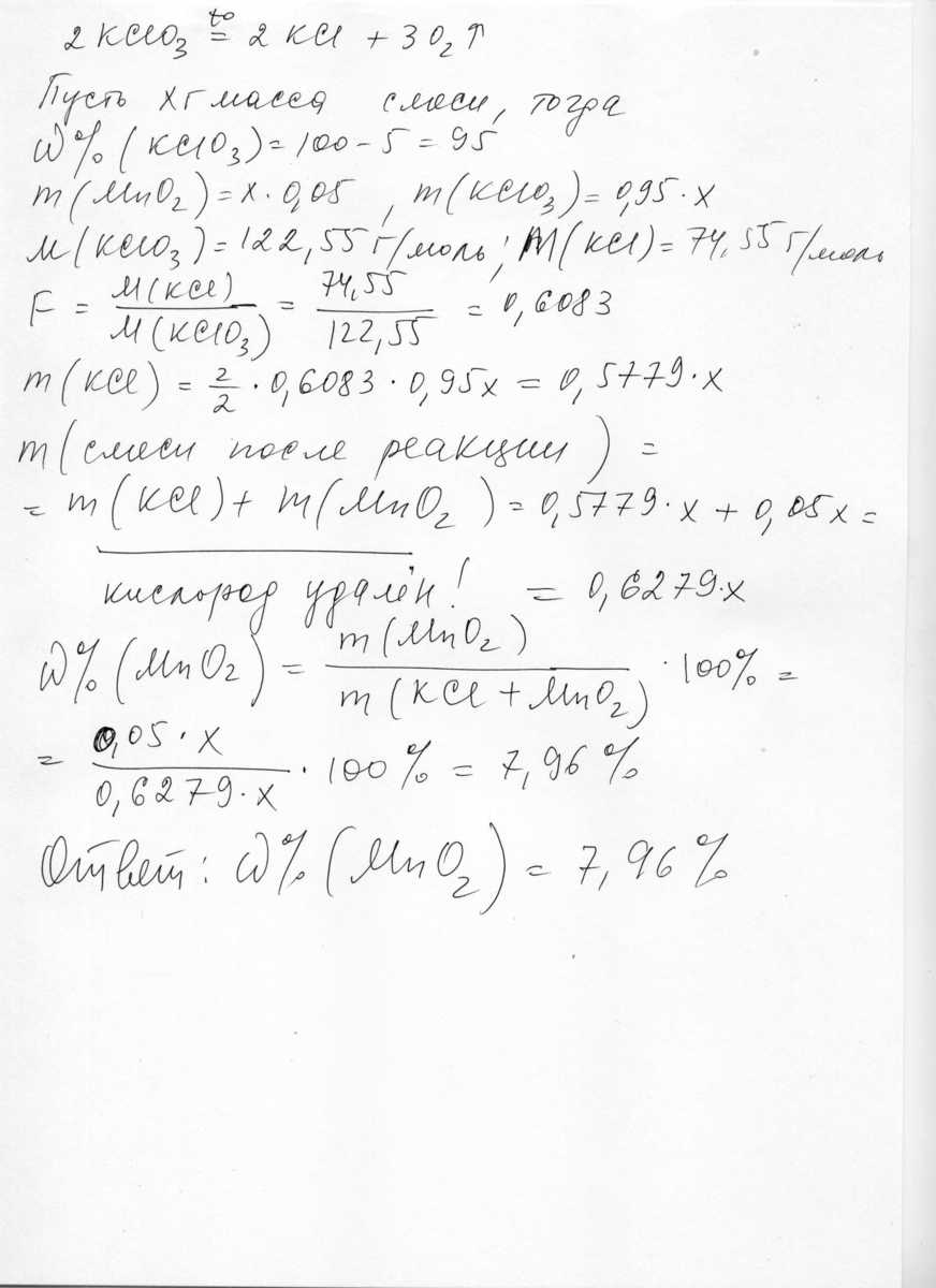 Для получения кислорода приготовили смесь, содержащую бертолетову соль KClO3 и катализатор – оксид марганца (IV), масса которого составила 5% от массы смеси. Смесь прокалили. Чему будет равна массовая доля катализатора в твердом остатке после полного разложения бертолетовой соли?