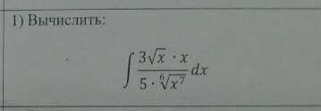 intlimits { frac{3 xsqrt{x} }{5 sqrt[6]{x^7} } } , dx = intlimits { frac{3 xsqrt{x} }{5 xsqrt[6]{x} } } , dx =  frac{3}{5} intlimits { frac{sqrt{x} }{sqrt[6]{x} } } , dx =frac{3}{5} intlimits { frac{ sqrt[6]{x^3}  }{sqrt[6]{x} } } , dx = \  \ =frac{3}{5} intlimits {  sqrt[6]{x^2} } , dx =frac{3}{5} intlimits {  sqrt[3]{x}  } , dx =frac{3}{5} intlimits { x^{ frac{1}{3} } } , dx = frac{3}{5}x^{ frac{4}{3} } * frac{3}{4} = frac{9}{20}x^{ frac{4}{3} } =   \