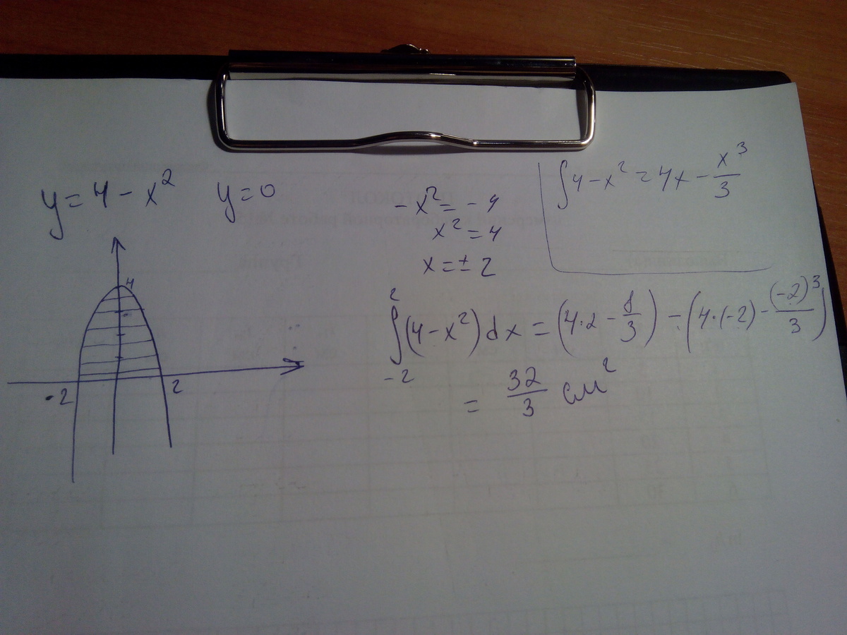 s=S(от -2 до 2)(4-x²(dx=4x-x³/3(от -2 до 2)=8-8/3+8-8/3=16-16/3=32/3=10 2/3кв ед