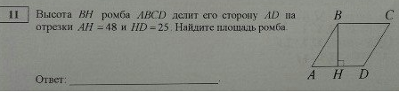 Высота BH ромба ABCD делит его сторону AD на отрезки AH=48 И HD=25. найдите площадь ромба.