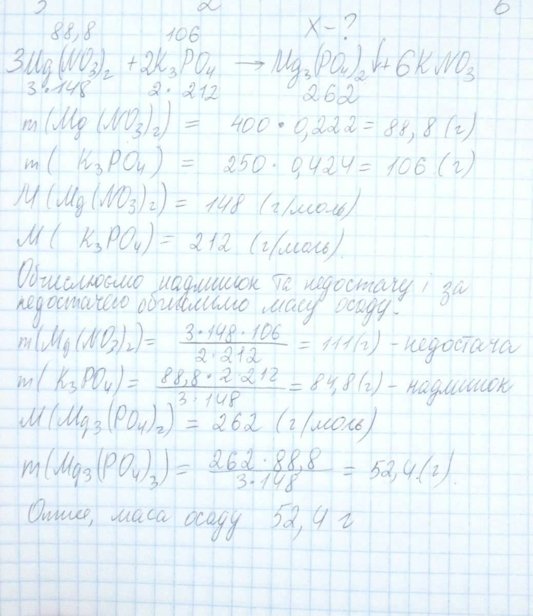 Розчин магній нітрату масою 400г з масовою часткою солі 22,2% змішали з розчином калій ортофосфату масою 250г з масовою часткою солі42,4%.Обчисліть та укажіть масу осаду,що при цьому утворився