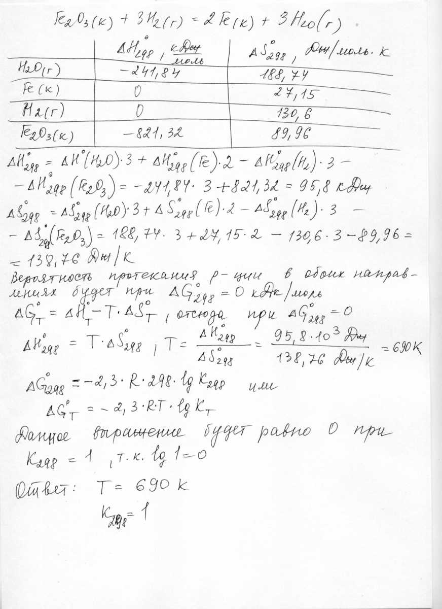 При какой температуре вероятность протекания реакции Fe2O3(k)+3H2(г)=2Fe(k)+3H2O в обоих направлениях будет одинакова? Чему равно при этом значение Кр?? СРОЧНО