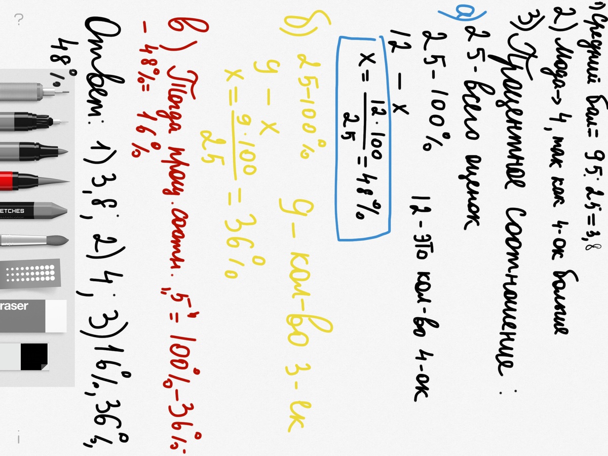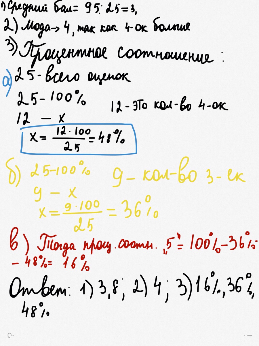 Вычисли средний балл по математике учащихся 2 класса с точностью до 0,1 если получили отметки 5 -4 учащихся. оценка 4 -12 учащ. оценка 3 -9 учащихся. укажи моду распределения оценок. найди процентное соотношение