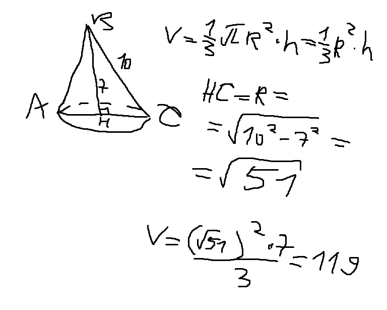 высота конуса равна 7 образующая равна 10. найдите его объем деленный на П
