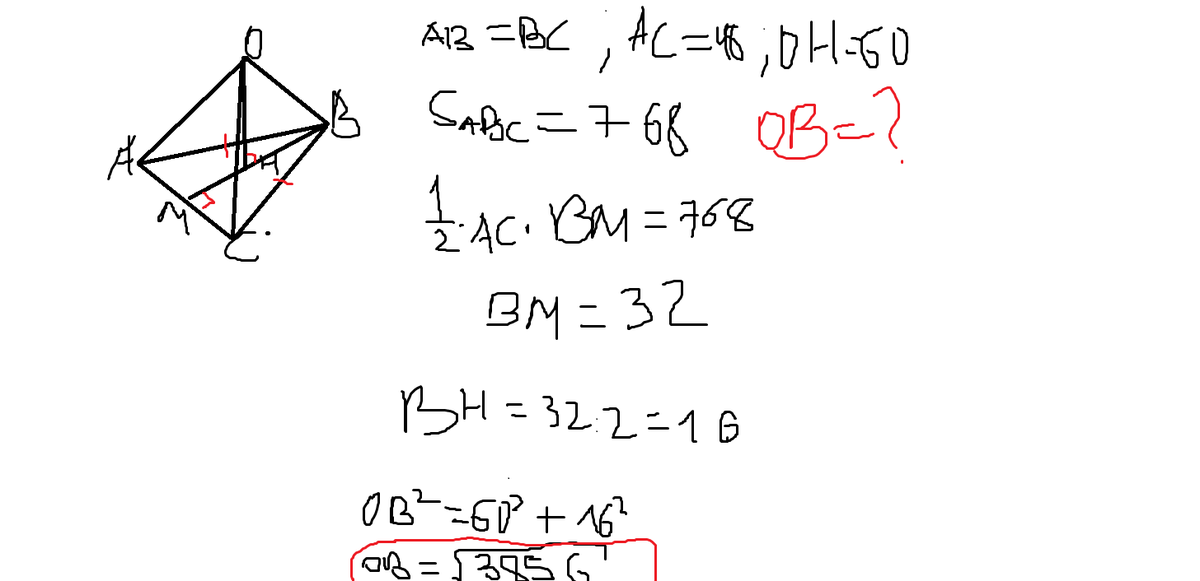 с основанием 48 равна 768. На расстоянии 60 от плоскости треугольника выбрана точка, находящаяся на одинаковом расстоянии от вершины треугольника. Найдите это расстояние