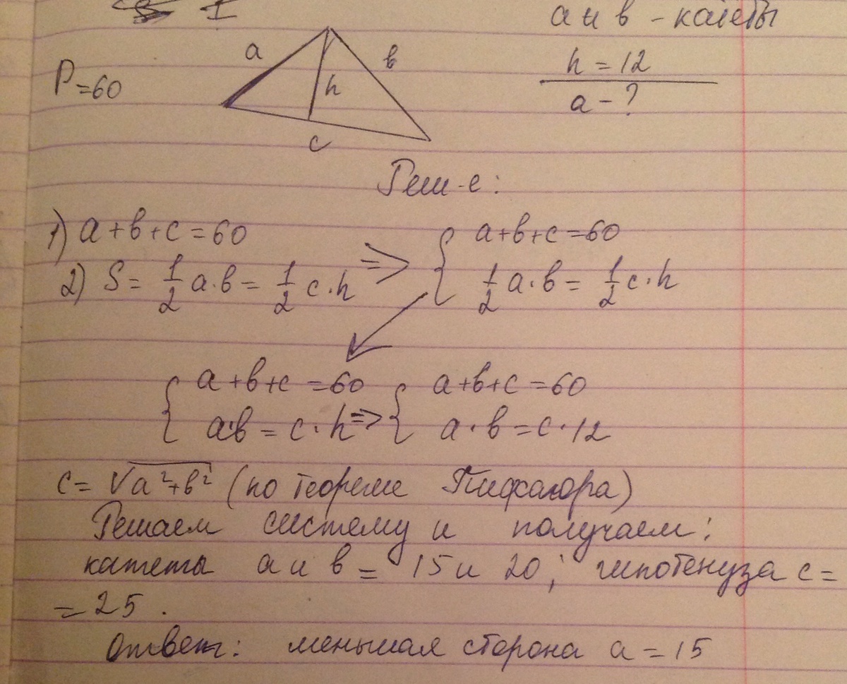 в прямоугольном треугольнике высота проведенная из вершины прямого угла равна 12 а периметр треугольника равен 60 найдите меньшую сторону треугольника.