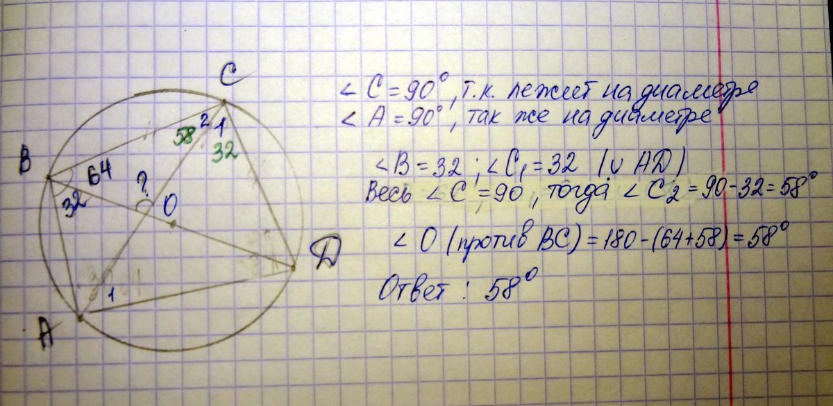 Диагональ BD четырехугольника ABCD является диаметром его описанной окружности, угол ABD = 32, угол CBD = 64.Найдите угол между диагоналями четырехугольника, который лежит против стороны BC