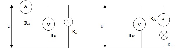 При включении приборов по схеме 2 вольтметр будет измерять не только падение напряжения на определенном сопротивлении, но и падение напряжения в обмотке амперметра, при этом погрешность тем меньше, чем меньше сопротивление амперметра по сравнению с измеряемым со-противлением.