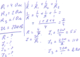 три лампочки опорами 4 Ом, 2 Ом і Ом ввімкнені в коло з напругою 220 В паралельно. Визначити загальний опір кола та силу струму в клжній лампочці?