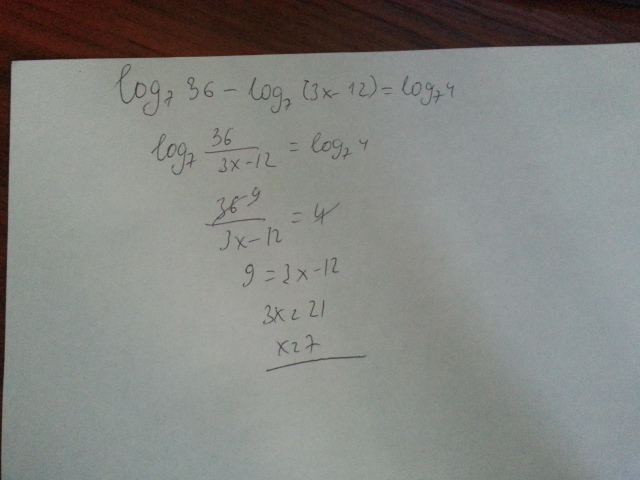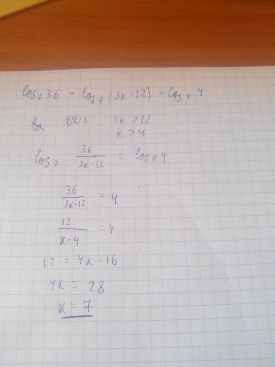 ответ 7 открываешь по формуле деление или минус а потом логорифмы оставляешь и сокрашаешь потом решаешь уравнение