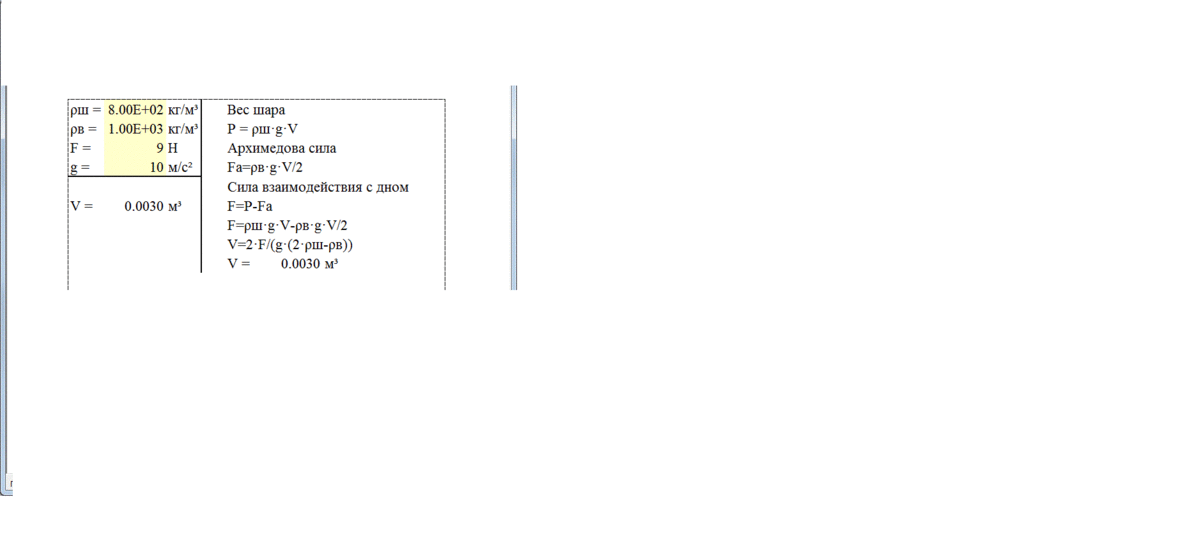 Деревянный (ρд =0,8 × 10^3 кг/м^3) шар лежит на дне сосуда, наполовину погрузившись в воду (ρв = 1 × 10^3 кг/м^3) Если модуль силы взаимодействия шара со дном сосуда F = 9 Н, то объем V шара равен?(дм^3)