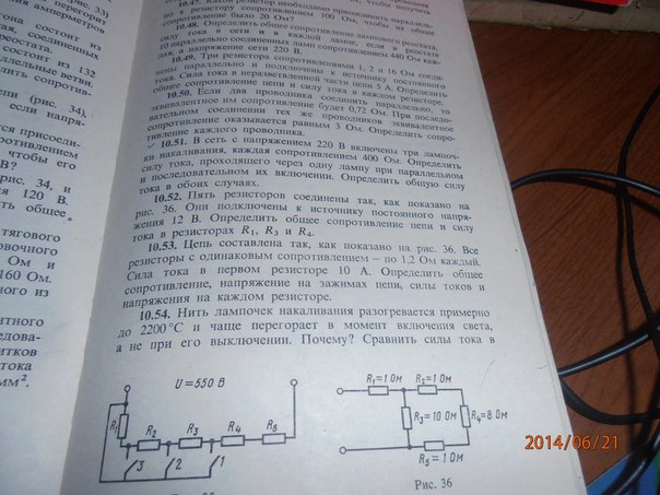 10.53Цепь составлена так, как показано на рис. 36. Всерезисторы с одинаковым сопротивлением — по 1,2 Ом каждый.Сила тока в первом резисторе 10 А. Определить общеесопротивление, напряжение на зажимах цепи, силы токов инапряжения на каждом резисторе.