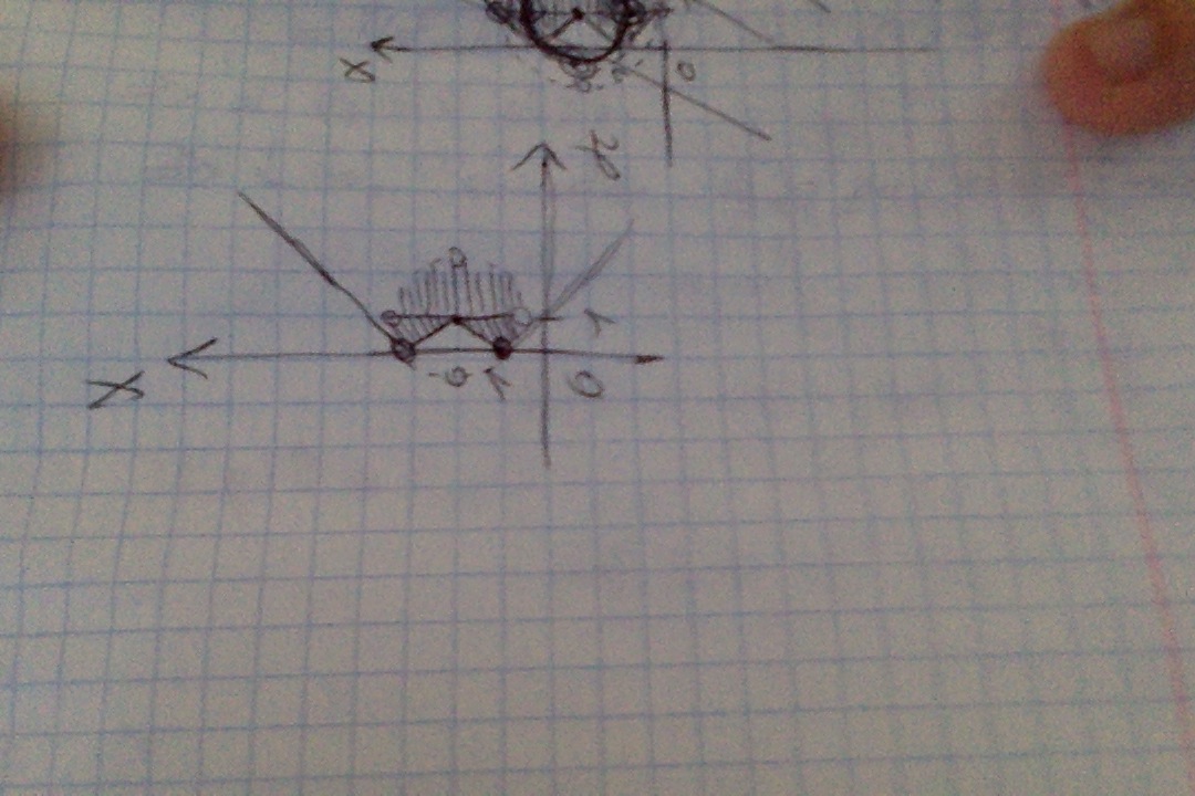 В итоге, строим график кусочно заданной функции модулей и круг без границы, все точки, находящиеся выше ломанной (графика функции - системы модулей), попадающие во внутрь круга являются решениями системы неравенств.