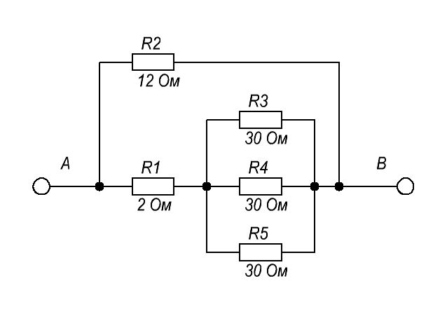 На рисунке дана схема электрической цепи. Напряжение UАВ = 120 В. Определить сопротивление всей цепи и силу тока в цепи.