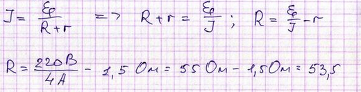 ЭДС источника тока равно 220 вольт, внутреннее сопротивление 1,5 ом. Какое надо взять сопротивление внешнего участка цепи, чтобы сила тока была равна 4А?