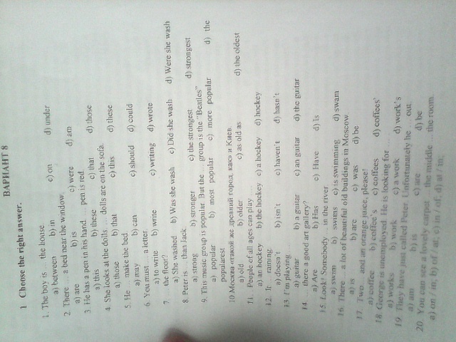 1 - b 2 - b 3 - a 4 - d 5 - c 6 - b 7 - c 8 - b 9 - b 10 - c 11 - d 12 - b 13 - d 14 - d 15 - c 16 - b 17 - a 18 - c 19 - b 20 - c
