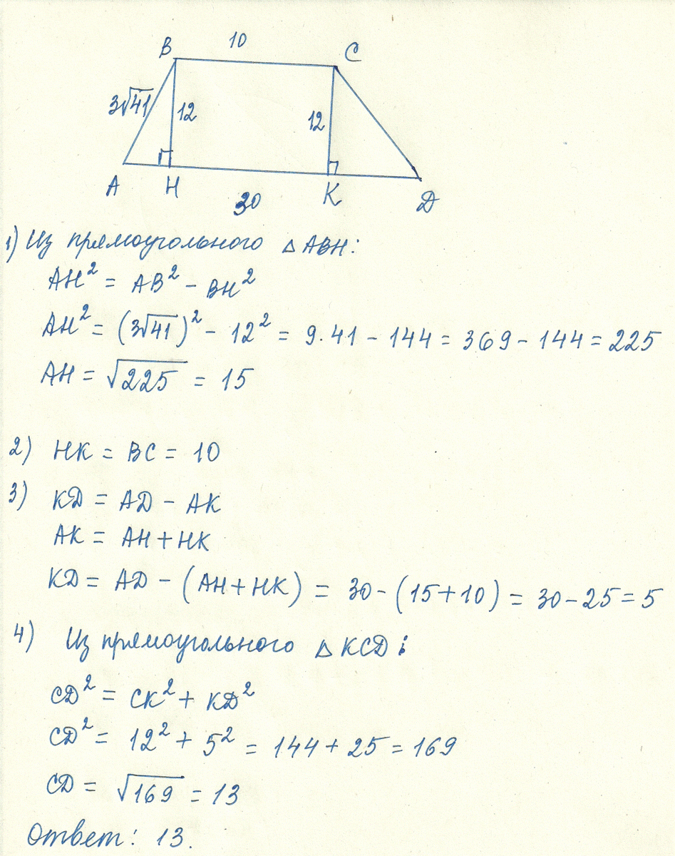 В трапеции с основаниями 10 и 30, высотой 12 и боковой стороной 3√41 другая боковая сторона равна ?