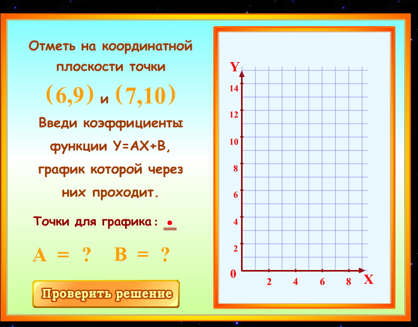 (6; 9); (7; 10); y=Ax+B\\A=frac{10-9}{7-6}=frac{1}{1}=1\\y=x+B\\6+B=9\B=9-6\B=3\\y=x+3\\A=1; B=3