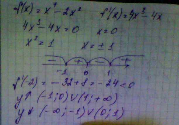 5) найти знаки в каждом промежутке подставляя любое значение из промежутка в производную, если - то убывает, если +то возрастает