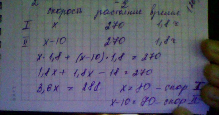 из двух пунктов рассстояние между которыми 270км одновременно друг другу вышли два поезда скорость одного из них на 10 км /ч меньше скорости друггого найдите скорость каждого поезда если они встретились начерез 1,8 ч после своего выхода