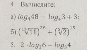 4. a)  log_{4}48- log_{4}3+3= log_{4} frac{48}{3}+3= log_{4}16+3= log_{4} 4^{2}+3= \ =2 log_{4}4+3=2*1+3=2+3=5 \