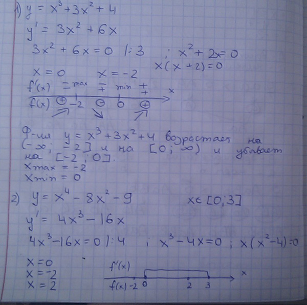 1)Исследовать функцию y=x^3+3x^2+4 на екстремум и найти промижутки возрастания и убывания.