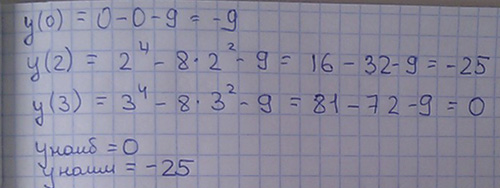 2)Найти наибольшое и наименьшое значения функции f(x)=x^4-8x^2-9 на отрезке [0;3]