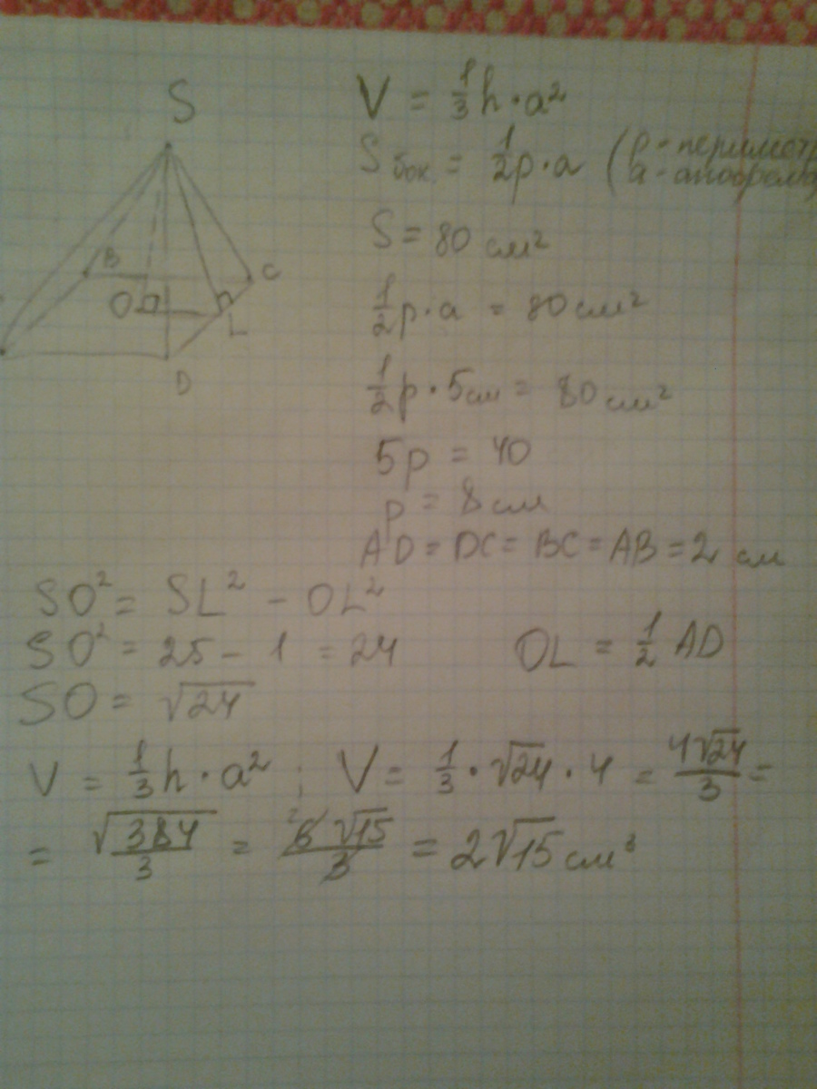 в правильной четырехугольной пирамиде апофема равна 5 см площадь боковой поверхности 80 см в кавадрате . найдите объём пирамиды