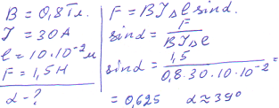 В однородном магнитном поле с индукцией 0,8 Тл на проводник с током в 30 А, длина активной части которого 10 см, действует сила 1,5 Н. Под каким углом к вектору индукции расположен проводник?