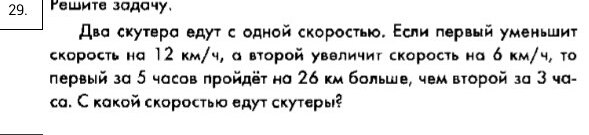 Пусть скорость первого скутера (х-12)км/ч, а скорость второго скутера (х+6) км/ч. Время за которое пройдет первый скутер 5ч, а второй - 3ч. Значит, путь 1го скутера равна 5(х-12), а второго 3(х+6). Первый скутер прошел на 26 км больше.