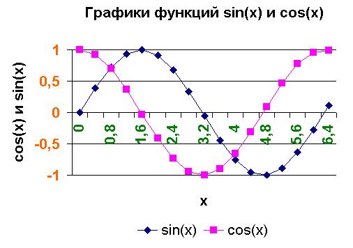 На отрезке [0; 6.4] (задано в радианах) с шагом 0.4