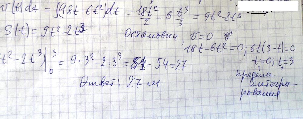 найти путь пройденный телом от начала движения до его остановки если скорость задана уровнением v(t)=18t-6t^2 мс