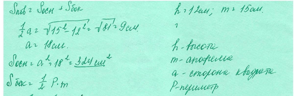 В правельной четырехугольной пирамиде высота равна 12 см,а апофема 15 см.Найдите площадь поверхности пирамиды.
