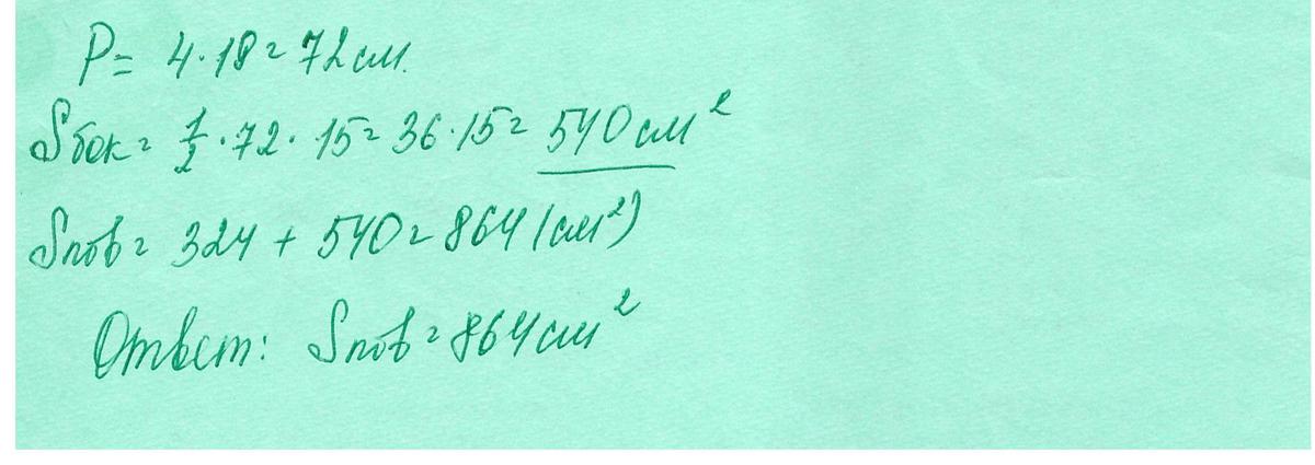 Найдем половину стороны основания а/2=√l²-h²=√15²-12²=√81=9, а=18. Площадь S=Sб+So=1/2*4a*l+a*a=2*18*15+18*18=540+324=864.
