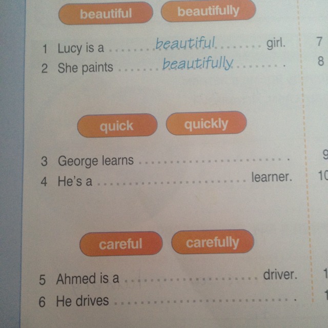Объясняю. Прилагательные служат для описания предметов, называют их признаки. Прилагательное отвечают на вопрос: "Какой?". Наречия отвечают на вопрос: "Как?". Большинство наречий в английском языке образованы при помощи добавления суффикса -ly к прилагательным. Есть исключения. Их не так много, нужно просто запомнить. Например, "good" (хороший) и "well" (хорошо). Как определить, где должно стоять прилагательное, а где наречие? Прилагательное в предложении относится к какому-либо существительному с артиклем. Пример из этого упражнения: "He's a quick learner" (Он сообразительный ученик). Здесь "quick" - прилагательное, а "a learner" - существительное с неопределенным артиклем. "George learns quickly" (Джордж быстро учится). Здесь "quickly" - наречие, т.к. отвечает на вопрос "(учится) как?" и имеет суффикс -ly.