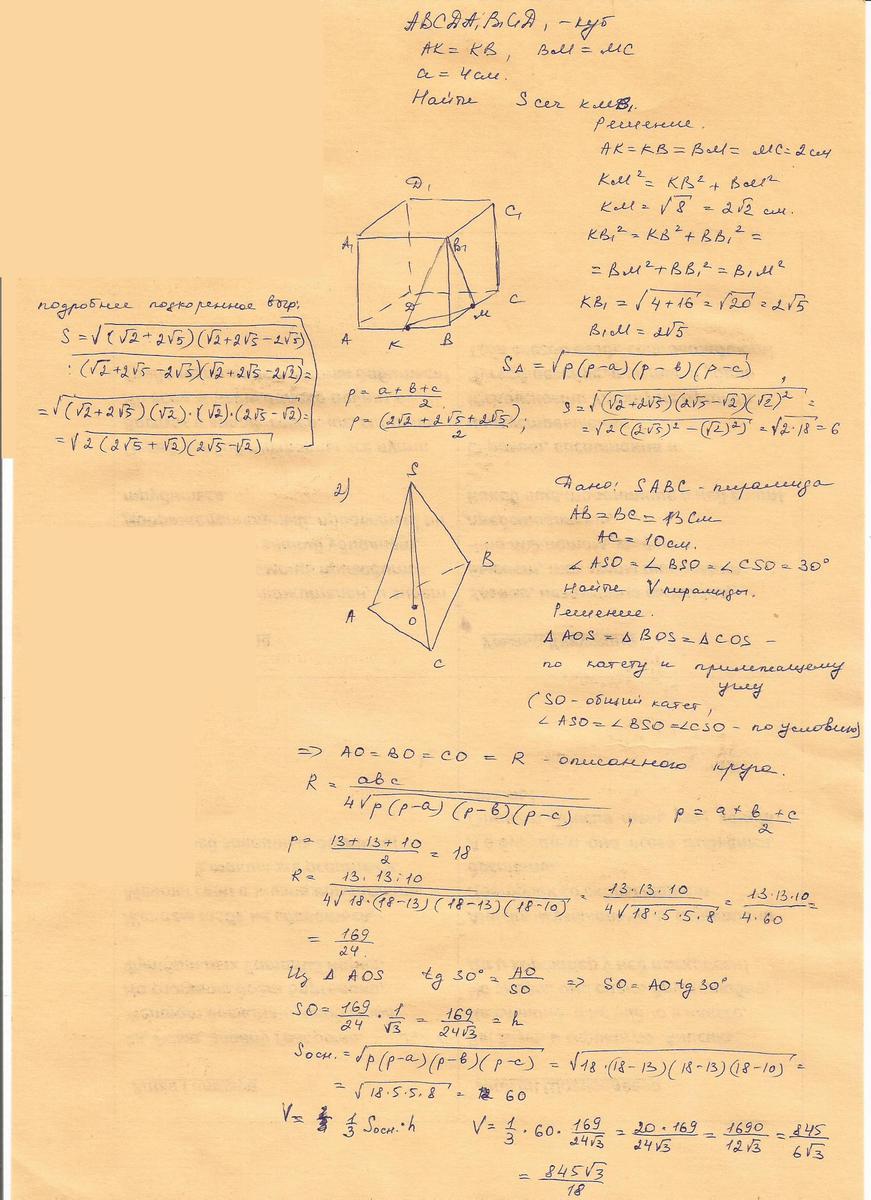 №2 основание пирамиды-равнобедренный треугольник АВС, в котором АВ=ВС=13 см, АС=10 см. каждое боковое ребро пирамиды образует с ее высотой угол в 30'. вычислить объем пирамиды