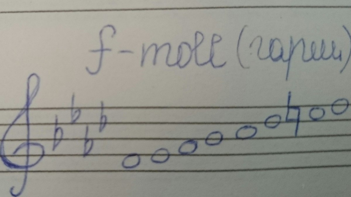Сначала нужно построить натуральный фа минор, затем вспомнить, что в гармоническом миноре повышается седьмая ступень. В данном случае это ми. Но при ключе стоит бемоль, поэтому будет ми-бекар.
