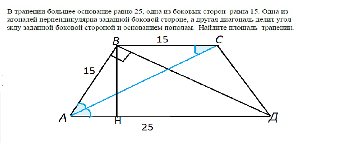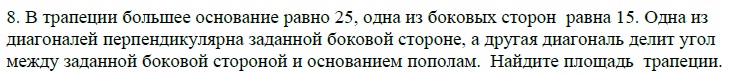 Одна из диагоналей перпендикулярна заданной боковой стороне, а другая диагональ делит угол между заданной боковой стороной и основанием пополам. Найдите площадь трапеции.