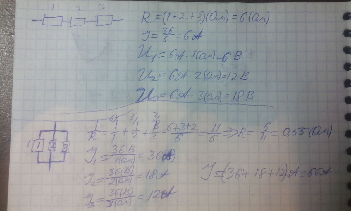 36 В. Определить: а) при последовательном соединении общее сопротивление, ток в