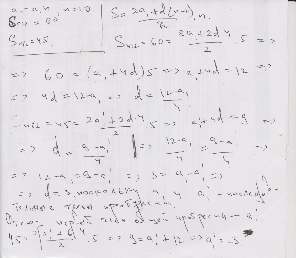 среди первых десяти членов арифметической прогрессиии сумма членов стоящих на нечётных местах равна 45, а сумма членов стоящих на чётных местах равна 60. найти первый член прогрессии помогите^^