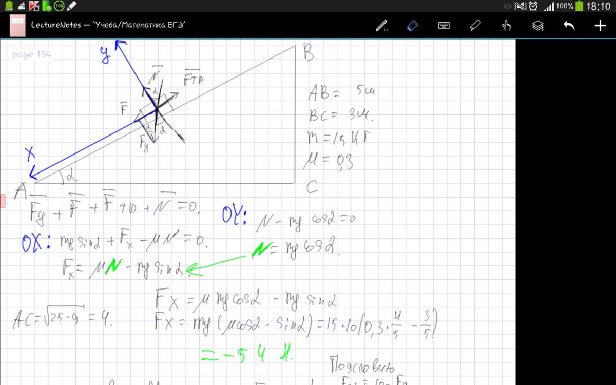 Мы сделали рисунок наклонной плоскости, указали все действующие на тело силы, написали 2ой закон ньютона в векторной форме, спроектировали силы на оси OX и OY, подставив необходимые данные нашли искомую силу ( в данном случае она отрицательна, т.е. сила будет направлена вверх относительно плоскости и она обеспечит равномерный спуск бруска)